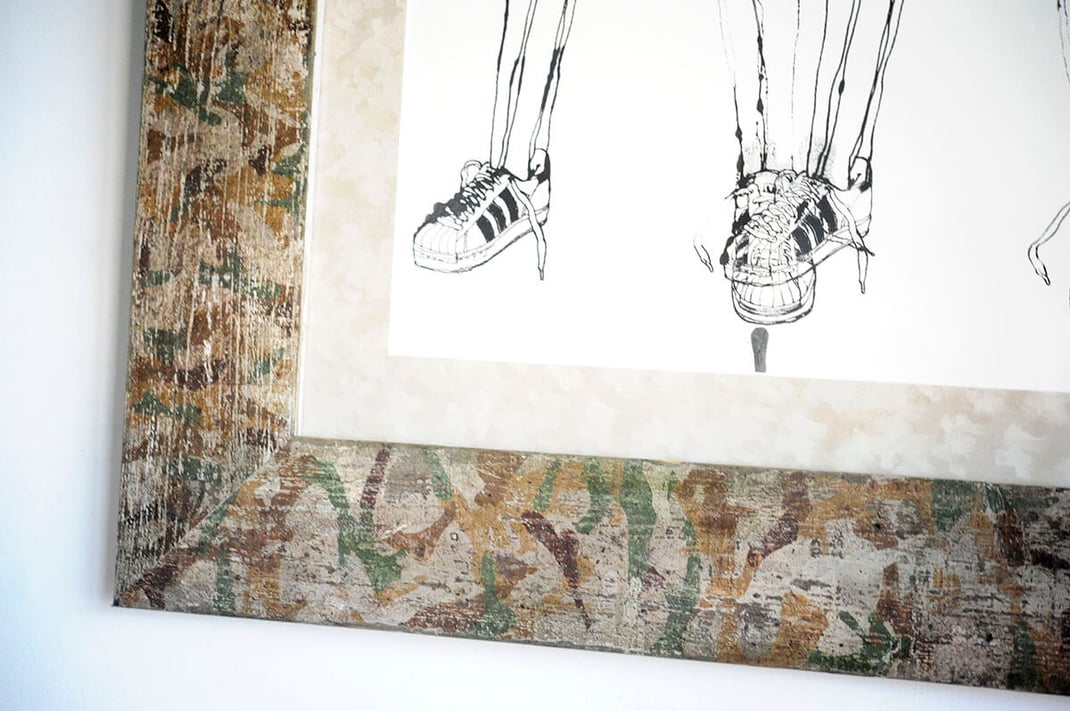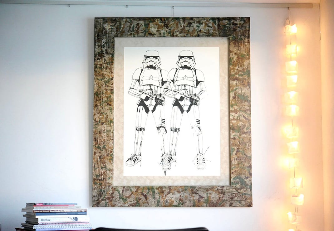 WRONGWROKS(ウロングロックス)の”STORMTROOPER SUPERSTAR"を額縁は「迷彩エイジング」、マットボードは「コットンスエード素材のアイボリー」で額装しました。